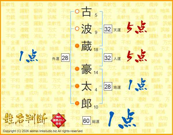 古(5画)波(9画)蔵(18画) 豪(14画)太(4画)郎(10画)
