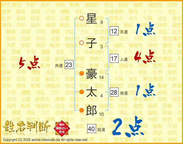 星(9画)子(3画) 豪(14画)太(4画)郎(10画)
