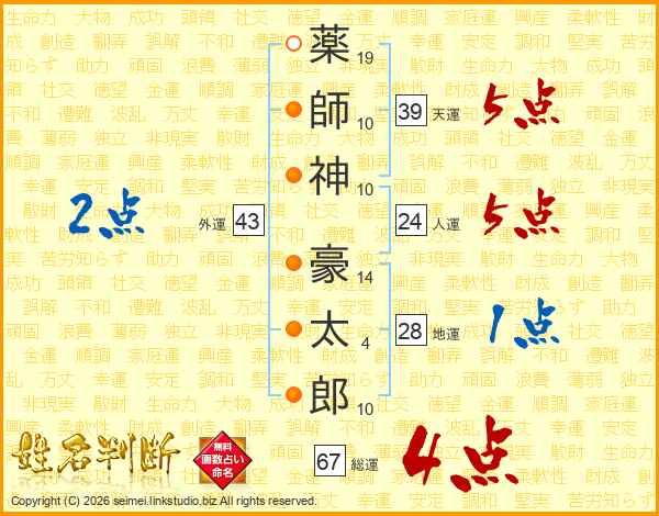 薬(19画)師(10画)神(10画) 豪(14画)太(4画)郎(10画)