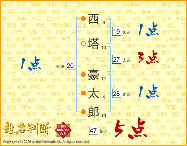 西(6画)塔(13画) 豪(14画)太(4画)郎(10画)