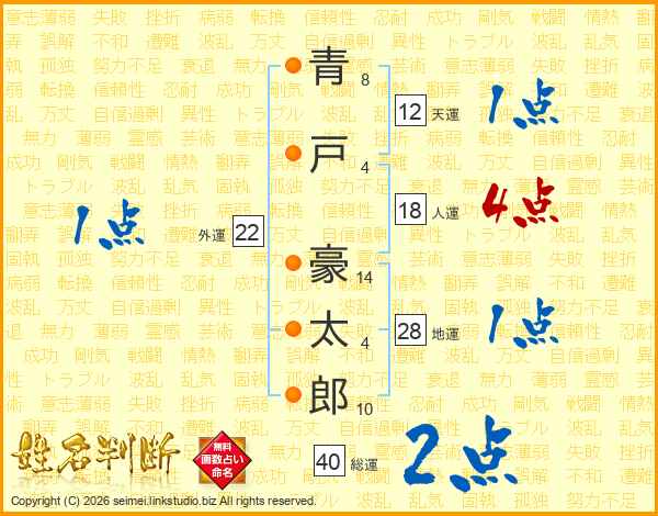 青(8画)戸(4画) 豪(14画)太(4画)郎(10画)