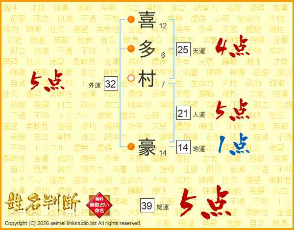 喜多村豪さんの総運は39画の5点!