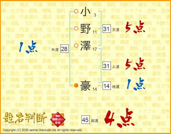 小野澤豪さんの総運は45画の4点!