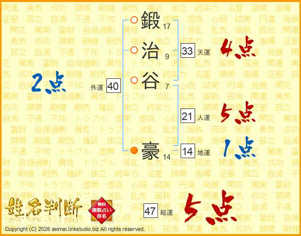 鍛(17画)治(9画)谷(7画) 豪(14画)