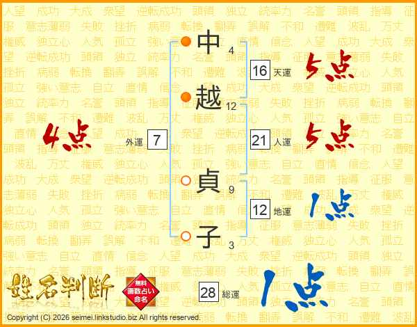 生活面を象徴する運勢です。外部から受ける影響力を表し、結婚運、家庭運や職場、環境への順応性を表します。総運から人運を引いた画数。姓や名が1文字の場合を除く。