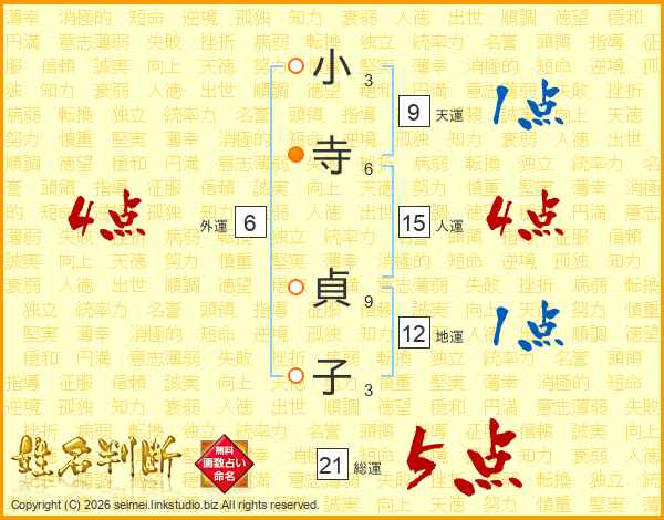 生活面を象徴する運勢です。外部から受ける影響力を表し、結婚運、家庭運や職場、環境への順応性を表します。総運から人運を引いた画数。姓や名が1文字の場合を除く。