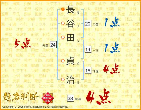 長(8画)谷(7画)田(5画) 貞(9画)治(9画)
