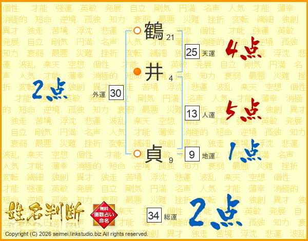 あなたの人生を表す1番重要な運勢です。生涯を通じて影響する総合運となり、主に50歳以降の晩年期に影響を及ぼします。苗字と名前の合計画数。
