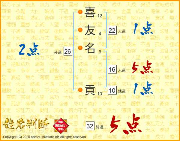 生活面を象徴する運勢です。外部から受ける影響力を表し、結婚運、家庭運や職場、環境への順応性を表します。総運から人運を引いた画数。姓や名が1文字の場合を除く。