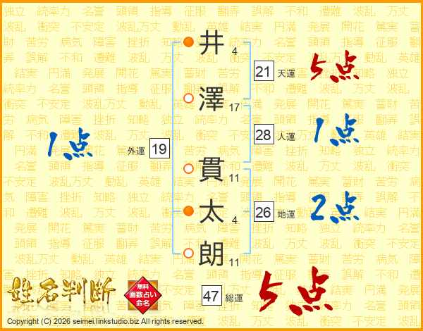 井(4画)澤(17画) 貫(11画)太(4画)朗(11画)