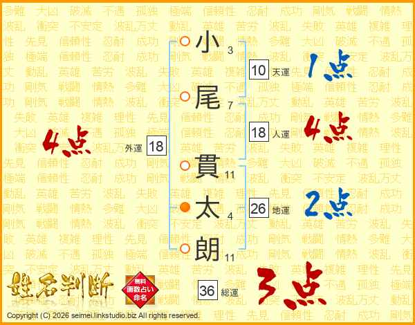 小尾貫太朗さんの総運は36画の3点!