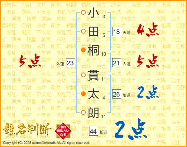 小(3画)田(5画)桐(10画) 貫(11画)太(4画)朗(11画)