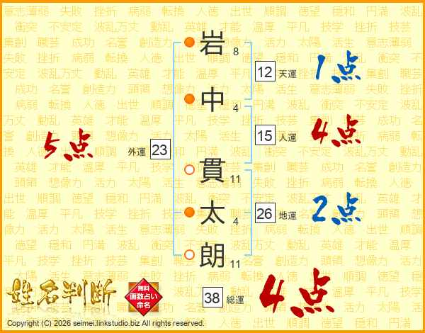 岩(8画)中(4画) 貫(11画)太(4画)朗(11画)