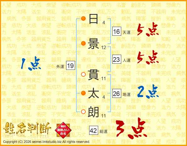 日(4画)景(12画) 貫(11画)太(4画)朗(11画)