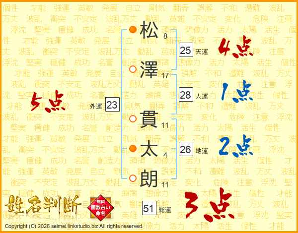 松(8画)澤(17画) 貫(11画)太(4画)朗(11画)