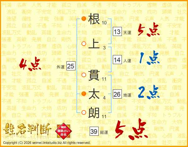 根(10画)上(3画) 貫(11画)太(4画)朗(11画)