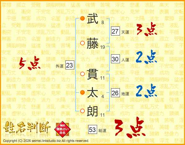 武(8画)藤(19画) 貫(11画)太(4画)朗(11画)