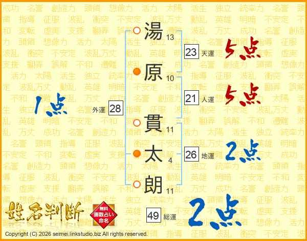 湯原貫太朗さんの人運は21画の5点!