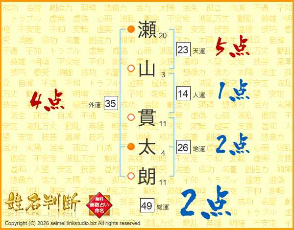 瀬山貫太朗さんの総運は49画の2点!