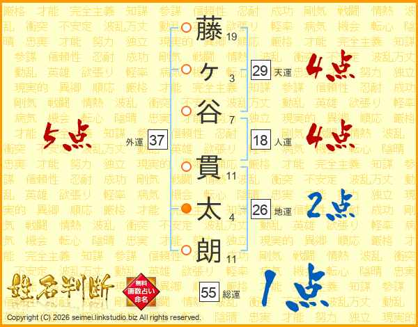 藤(19画)ヶ(3画)谷(7画) 貫(11画)太(4画)朗(11画)
