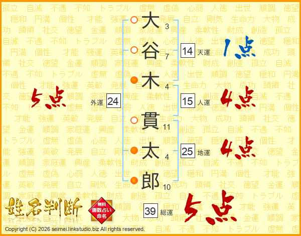 大(3画)谷(7画)木(4画) 貫(11画)太(4画)郎(10画)