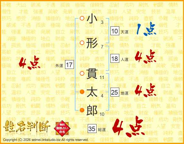 小(3画)形(7画) 貫(11画)太(4画)郎(10画)