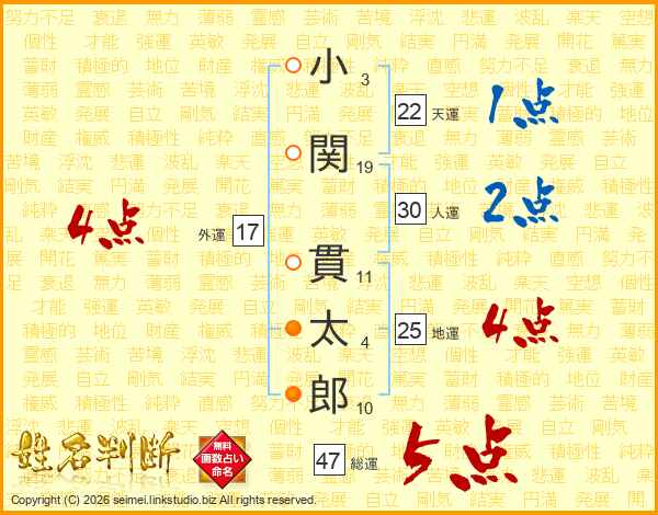 小(3画)関(19画) 貫(11画)太(4画)郎(10画)