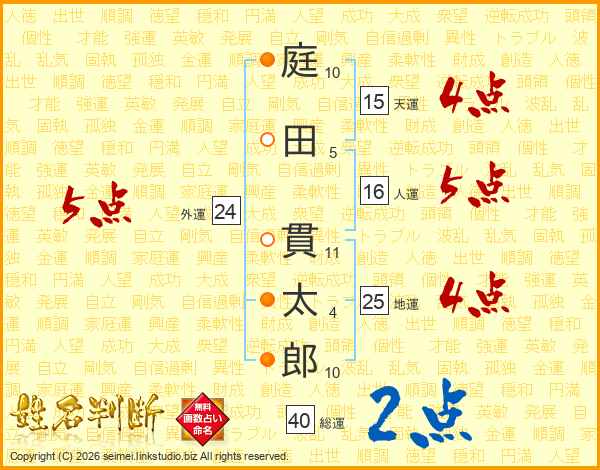 庭(10画)田(5画) 貫(11画)太(4画)郎(10画)