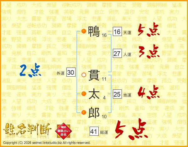 鴨(16画) 貫(11画)太(4画)郎(10画)