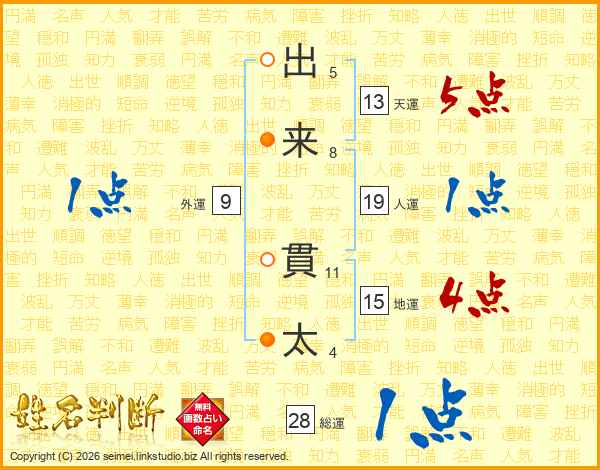 あなたの人生を表す1番重要な運勢です。生涯を通じて影響する総合運となり、主に50歳以降の晩年期に影響を及ぼします。苗字と名前の合計画数。