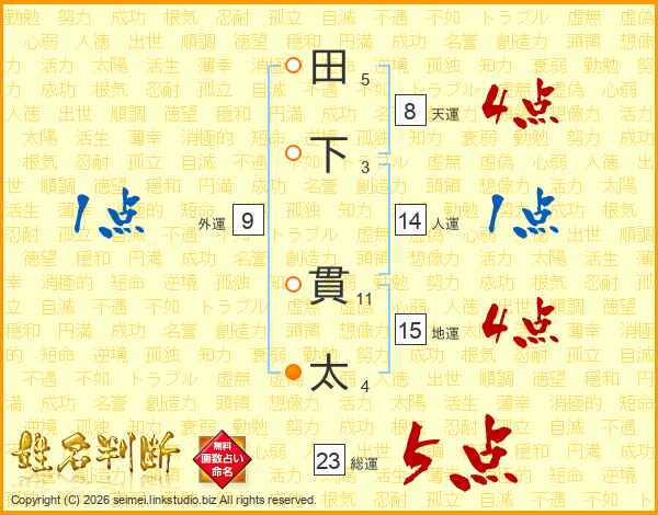 生活面を象徴する運勢です。外部から受ける影響力を表し、結婚運、家庭運や職場、環境への順応性を表します。総運から人運を引いた画数。姓や名が1文字の場合を除く。