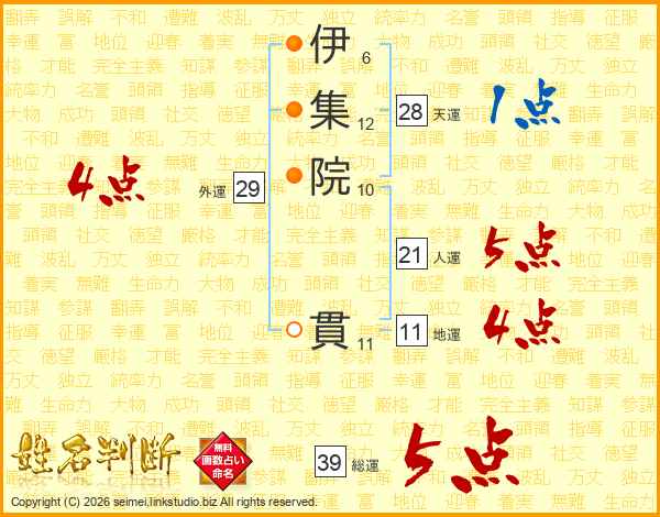 あなたの人生を表す1番重要な運勢です。生涯を通じて影響する総合運となり、主に50歳以降の晩年期に影響を及ぼします。苗字と名前の合計画数。