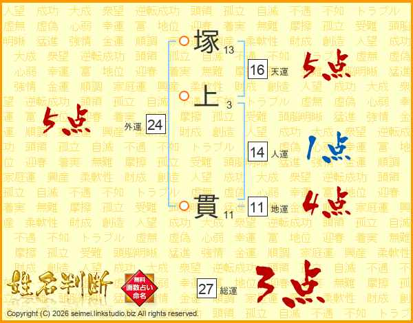 塚上貫さんの総運は27画の3点!