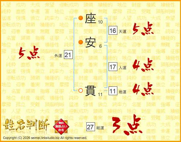あなたの人生を表す1番重要な運勢です。生涯を通じて影響する総合運となり、主に50歳以降の晩年期に影響を及ぼします。苗字と名前の合計画数。