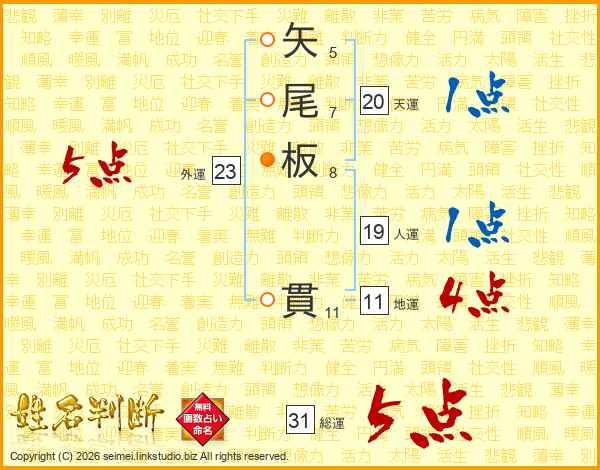 矢尾板貫さんの総運は31画の5点!