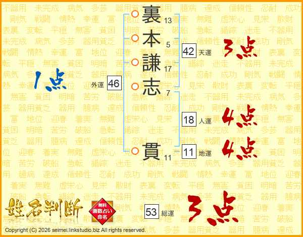 裏本謙志貫さんの総運は53画の3点!