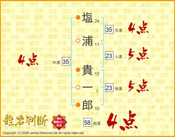塩(24画)浦(11画) 貴(12画)一(1画)郎(10画)