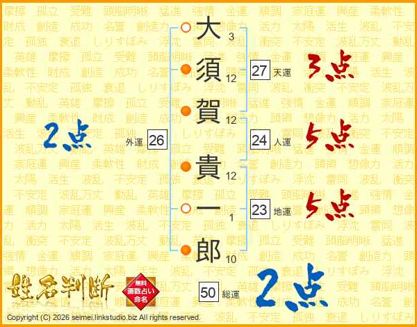 大(3画)須(12画)賀(12画) 貴(12画)一(1画)郎(10画)