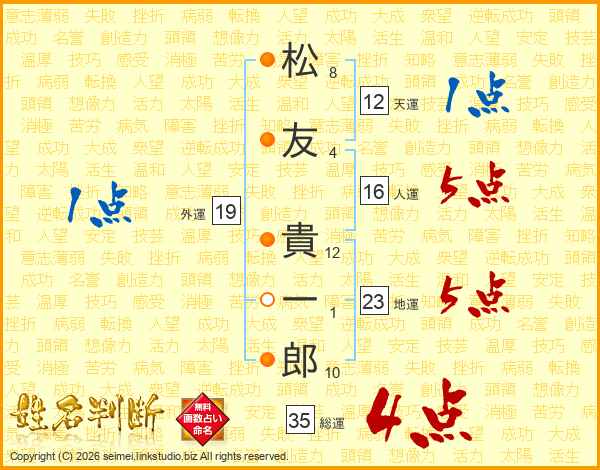 松(8画)友(4画) 貴(12画)一(1画)郎(10画)