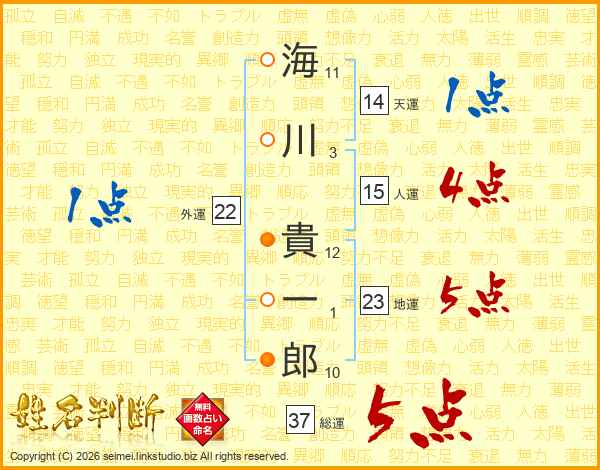 海(11画)川(3画) 貴(12画)一(1画)郎(10画)