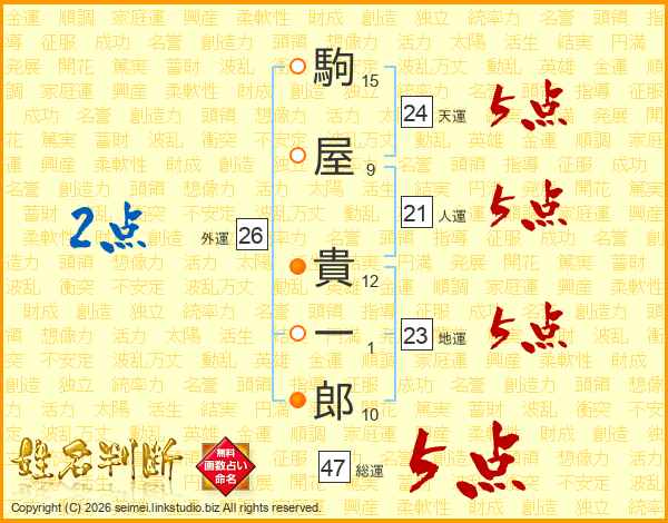 駒(15画)屋(9画) 貴(12画)一(1画)郎(10画)