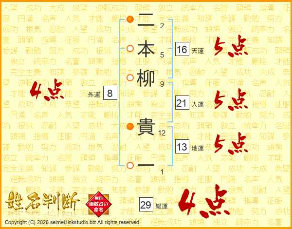 二本柳貴一さんの総運は29画の4点!