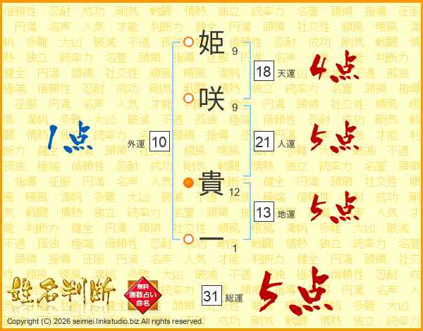 姫咲貴一さんの総運は31画の5点!