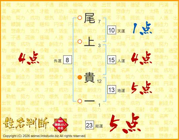 生活面を象徴する運勢です。外部から受ける影響力を表し、結婚運、家庭運や職場、環境への順応性を表します。総運から人運を引いた画数。姓や名が1文字の場合を除く。