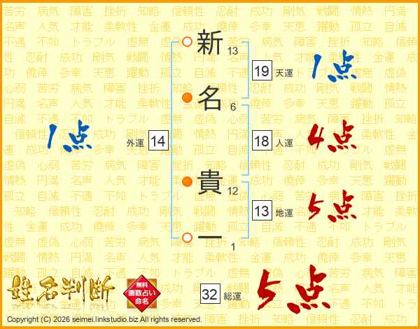 新(13画)名(6画) 貴(12画)一(1画)