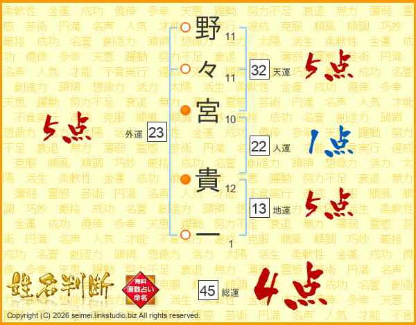 野々宮貴一さんの総運は45画の4点!