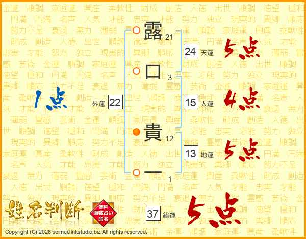 生活面を象徴する運勢です。外部から受ける影響力を表し、結婚運、家庭運や職場、環境への順応性を表します。総運から人運を引いた画数。姓や名が1文字の場合を除く。
