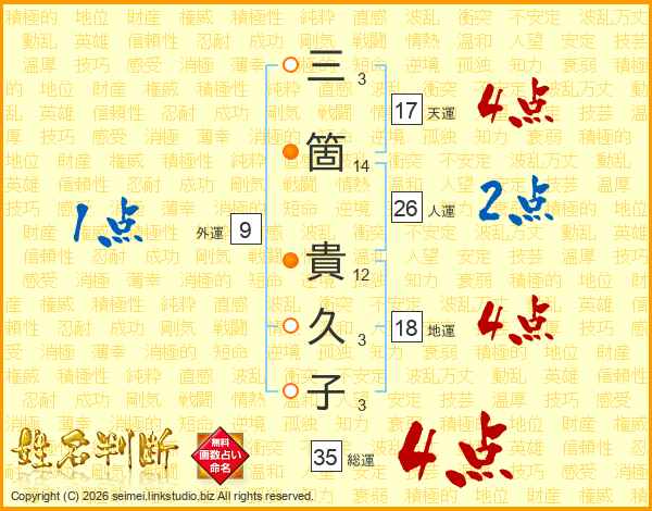 三(3画)箇(14画) 貴(12画)久(3画)子(3画)