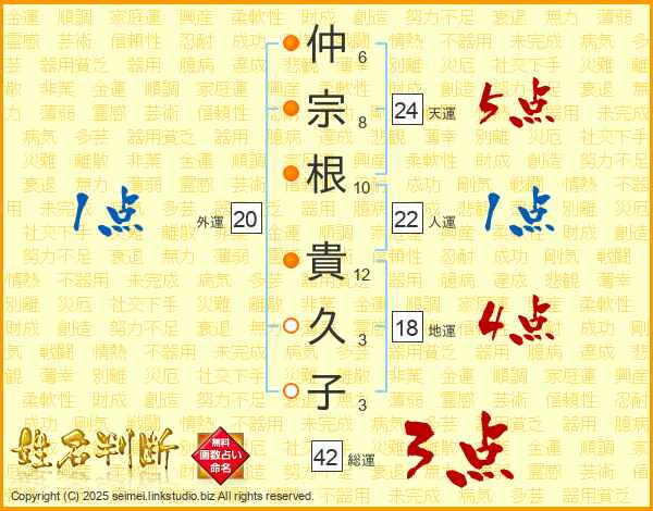 仲(6画)宗(8画)根(10画) 貴(12画)久(3画)子(3画)