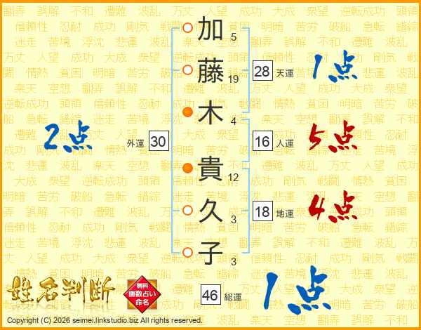 加(5画)藤(19画)木(4画) 貴(12画)久(3画)子(3画)
